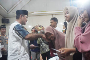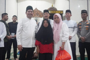Usai melaksanakan sholat tarawih, Bupati Bengkulu Utara, Arie juga nampak memberikan sejumlah bantuan dan santunan kepada masyarakat desa setempat dan pengurus masjid.